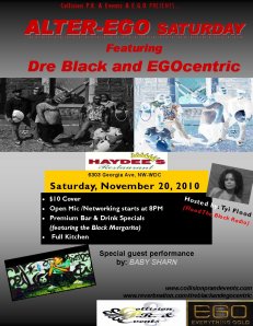 Each and Every 3rd Saturday of the month Dre Black & EGOCENTRIC rocks out at Haydee’s Lounge located at 6303 Georgia Ave NW, WDC. Doors open a 7pm, and the show kicks off at 8:00 pm, with special performances before the band hits the stage. This Saturday’s special guest will be Baby Sharn.