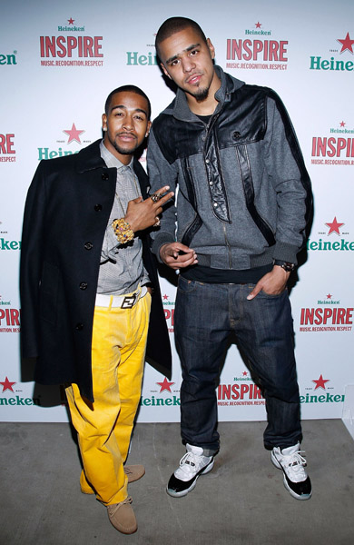 NEW YORK – NOVEMBER 13: Singer Omarion (L) and rapper J. Cole attend Heineken Inspire Encore Event featuring Nas, Cee Lo Green, Diplo, Pete Rock, J. Cole and Roxy Cottontail at Basketball City – Pier 36 – South Street on November 13, 2010 in New York City. (Photo by Joe Kohen/WireImage for Heineken)