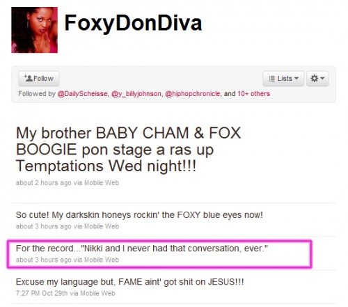 In yet another twist to the tale, though , Kim’s long-time nemesis Foxy Brown has added her two cents to the drama. With Minaj citing Brown as the individual who informed her of Kim’s supposed “transgressions”, what did the Ill Nana have to say?