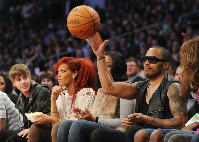 Musician Lenny Kravitz (R) returns a loose ball as Singers Justin Bieber (L) and Rihanna (2nd L) look on during the All-Stars Game at the Staples Center in Los Angeles on February 20, 2011. The game won by the West team 148-143, is the 60th NBA All-Star Game showdown between the Eastern and Western conference superstars. AFP PHOTO/Mark RALSTON (Photo credit should read MARK RALSTON/AFP/Getty Images)
