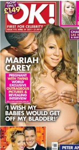 Mariah Carey is helping her husband Nick Cannon to prepare for impending fatherhood by letting him hold her other twins. The naked duo are featured on the cover of the latest issue of OK! magazine in a Janet Jackson style pose with a pregnancy twist.