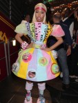 A blonde Nicki Minaj turned heads in a colorful outfit made of tickets with stuffed teddy bears covering her heels. She presented the orange blimp for Favorite Music Group with Hunger Games star Josh Hutcherson.