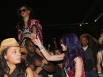 Snoop Dogg wasn’t the only one sending out smoke signals at Coachella. Rihanna lit up the stage and a joint during her fun-filled weekend in the desert. The pop star joined DJ Calvin Harris during his dance-fueled set at the Sahara tent on Sunday. Wearing a cropped tank top that read “Peace” and studded cutoff shorts, the wild child crowd surfed as she performed her Harris-produced hit “We Found Love” and new single “Where Have You Been,” even getting her friend Katy Perry to join in.