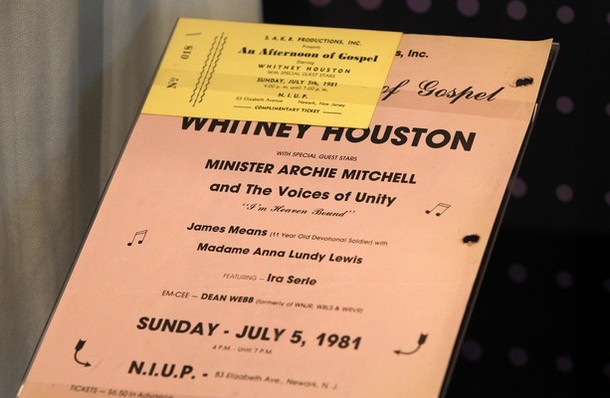 A ticket and program for one of the early performances by the late singer Whitney Houston as a gospel singer in church is pictured during a press preview of the new exhibit “Whitney! Celebrating The Musical Legacy of Whitney Houston”, at The Grammy Museum in Los Angeles, California August 15, 2012. Grammy award winning singer Houston was found dead in a Beverly Hills hotel room on February 11, 2012. REUTERS/Fred Prouser (UNITED STATES – Tags: ENTERTAINMENT)