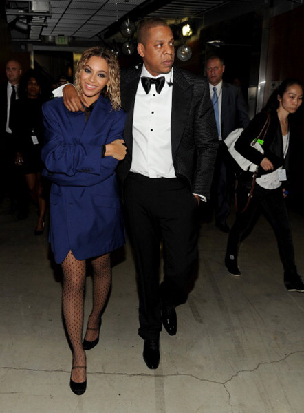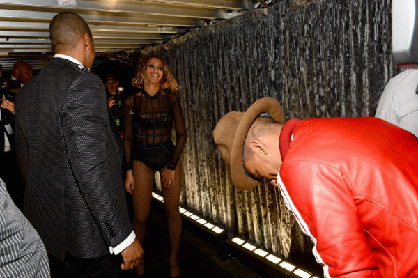 After performing “Drunk in Love,” a proud Jay Z walked backstage with one hand around Beyoncé. The couple showed PDA while seated in the front row. They also met up with Robin Thicke and his wife Paula Patton, as well as Pharrell, who bowed in Bey’s presence.