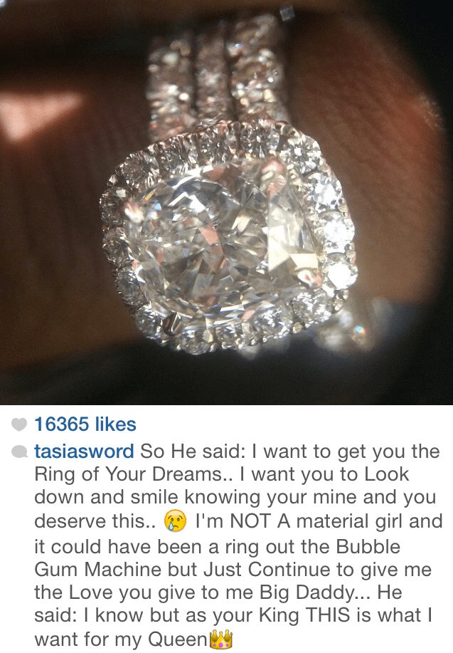 Fantasia Engaged? Posted on November 12, 2014 by M.E. Fantasia Barrino shared a picture of an eye-popping engagement ring she received from boyfriend Kendall Taylor. Share this: Click to share on X (Opens in new window) X Click to share on Facebook (Opens in new window) Facebook Like Loading... Related