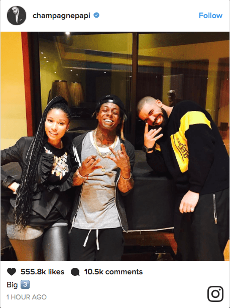 Nicki Minaj reunited with Drake and Lil Wayne on Instagram. She and Drake’s relationship had become strained over the years as each accumulated their own successes. Things became more awkward when Nicki starting dating rapper Meek Mill and engaged in a infamous rap beef with Drake. Now, all seems to be squashed between the two and their back to the music.