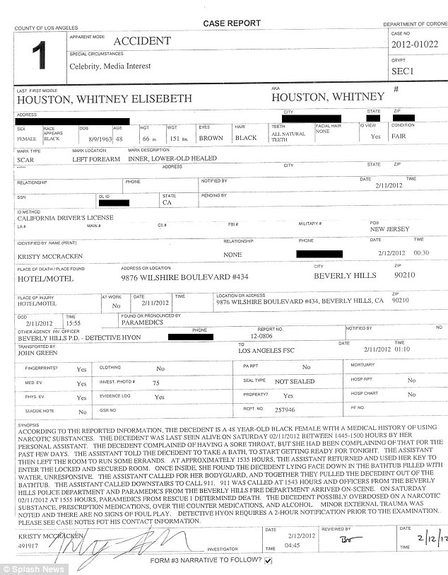 Kristy McCracken of the Bevely Hills Police Department also noticed an old needle puncture wound on Houston’s inner left elbow.
